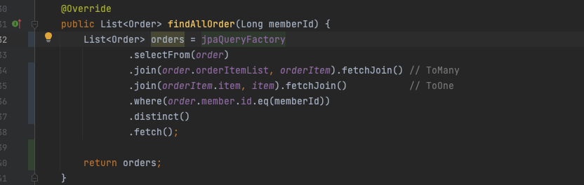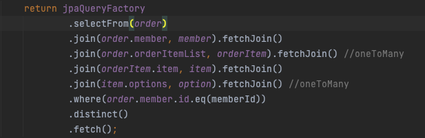 이제 주문과 주문상품, 상품 엔티티에 대해서 Fetch Join을 적용하여 한방 쿼리로 가져와야합니다.